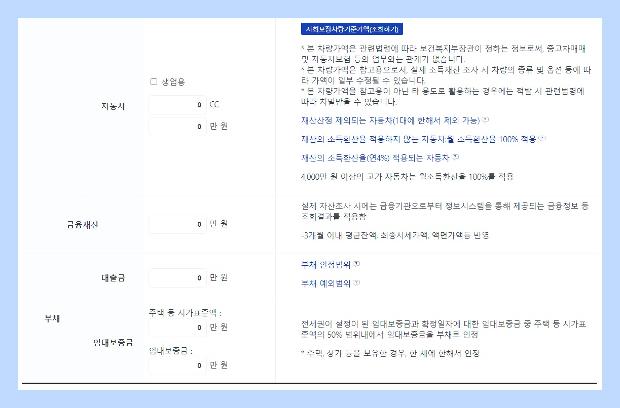 위의 소득정보 입력을 마치신분들은 이어서 아래의 재산 요건 중 해당되시는 것만 입력해주시면 됩니다. 만약 해당되는 사항이 없다면 전부 적지 않아도 되며, 정확하게 입력을 하지 않았을 경우에 실제로 기초연금 수령 금액이 달라질 수 있습니다. 위의 모든 사항을 전부 입력하셨으면 결과보기를 선택해주시면 기초연금 모의계산이 완료됩니다. 지금까지 기초연금 모의계산에 대한 내용 살펴봤습니다 감사합니다.